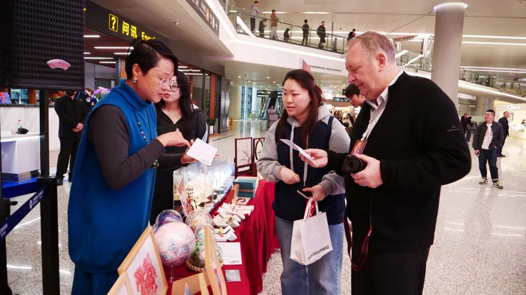除音乐“快闪”演出外,长宁文旅还打破传统文旅的固有框架,联合上海旅游咨询服务中心,共同开展长宁区非物质文化遗产展示与体验活动。在咨询服务中心内,上海丝绣、上海剪纸、沪上绣球及蛋雕等非遗技艺吸引了海内外游客纷纷驻足观赏。多位非遗代表性传承人亲临现场,详细介绍并亲身传授技艺,让游客朋友们在体验旅游公共服务的同时,领略非遗艺术带来的独特人文魅力。
