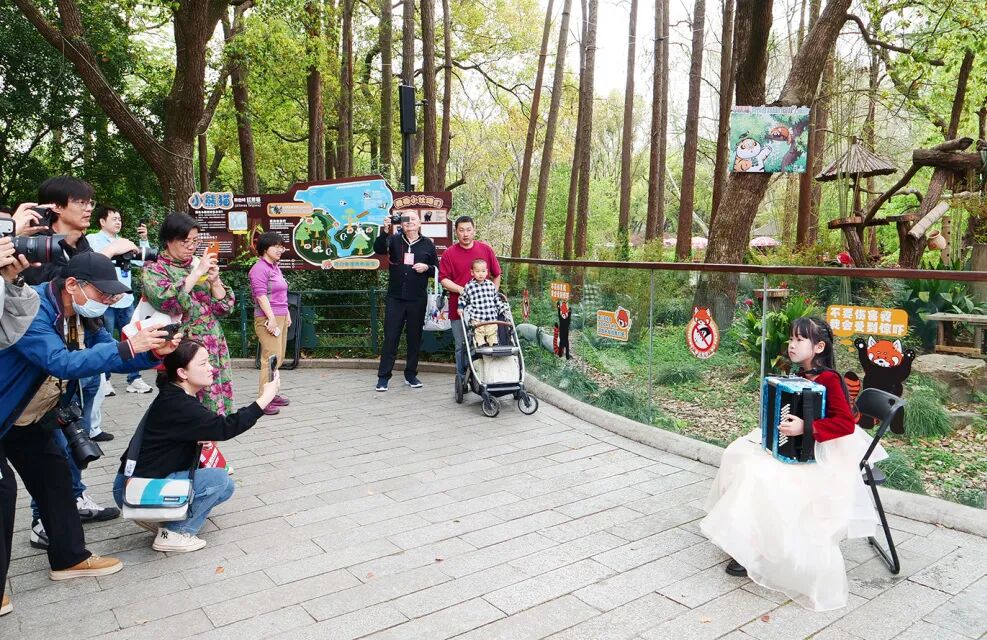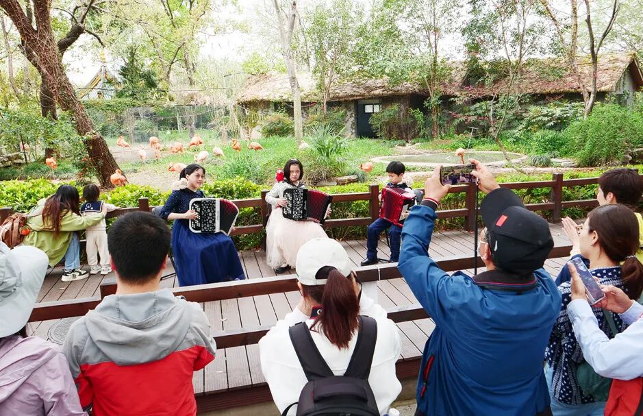 上午九点,上海动物园内轻快悠扬的手风琴旋律忽然响起。没有固定舞台,没有烦琐布景,演奏者们沿着园区步道,依次走进火烈鸟、小熊猫、灵长类展区等热门动物展区,以动物家园为天然背景,以游园步道为流动舞台,开启了一场无预告、零距离的快闪表演。