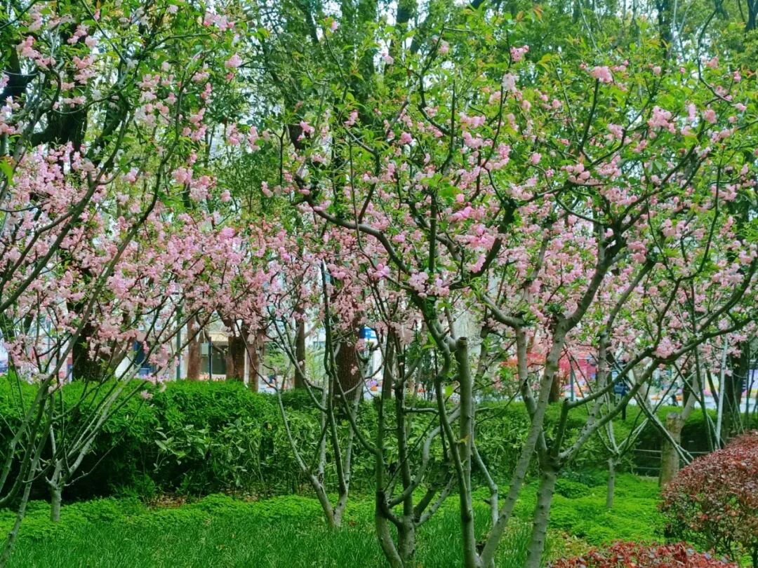 在华山绿地,多株海棠树同样正值盛花期。远远望去,粉色的花朵格外吸睛;走近细看,有的已然盛放,有的仍是含苞待放的花蕾。花蕾点点如胭脂,盛开的花朵粉嫩娇羞,深深浅浅的红汇成一片花海,流淌着春日的浪漫与诗意。一位在绿地散步的市民告诉记者:“最近这段时间绿地太美了,白玉兰、樱花、海棠一个接一个地开,走上一圈,看着美景,心里也觉得美滋滋的。”