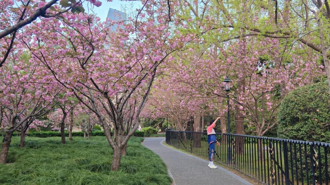 除了人气最旺的樱花林,公园内不少点位也点缀着晚樱。市民或在树下休息,或从树旁慢跑而过,那一树树娇嫩的花朵,让人真切感受到了充实而鲜活的春日气息。