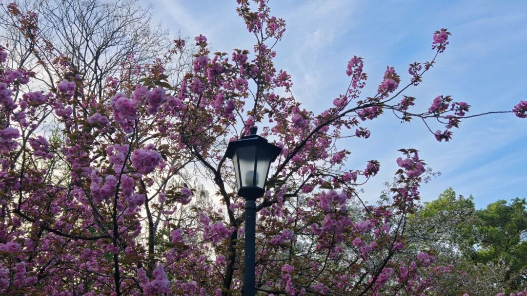 记者在公园看到,道路两侧的晚樱花开正盛,花量繁茂,缀满枝头。与早樱的淡雅轻盈不同,晚樱花瓣层层叠叠,色泽更为细腻温柔,饱满的花型也更耐得住近看。微风拂过,花瓣纷纷扬扬飘落,一场“樱花雨”引得路人纷纷放慢脚步,被春日胜景吸引。