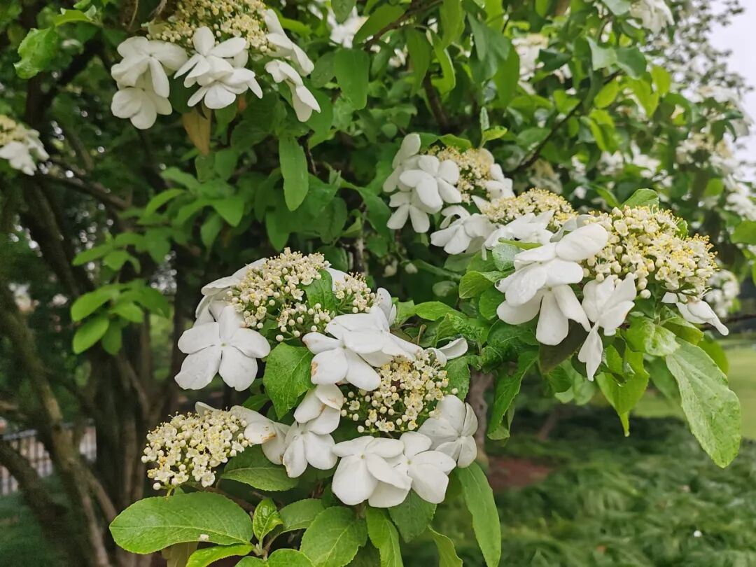 走在中山公园的步行道上,浓密的绿叶间,仿佛有几只白色蝴蝶围绕花蜜取食,一团一团的花布满全树。走近一看,会发现这一造型奇特、暗香浮动的琼花。