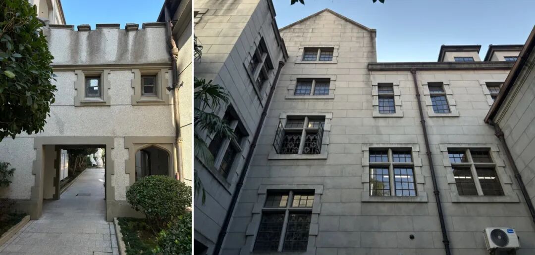 首先,在材质处理上,邬达克采用了灰色水泥拉毛粉刷,而非北美校园常见的红砖或石材。这一选择既有成本考量,也与上海本地工匠的施工传统相适应。更重要的是,灰色的中性基调削弱了哥特式的沉重感,使建筑在视觉上更为轻盈。