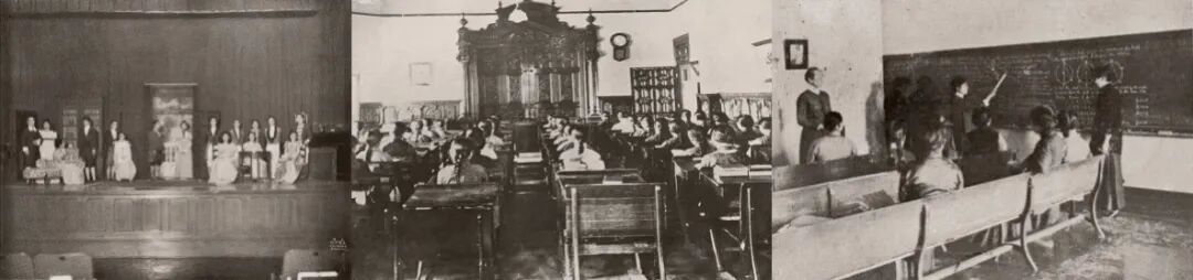 从左向右依次为中西女塾的话剧演出活动、自修课、数学课