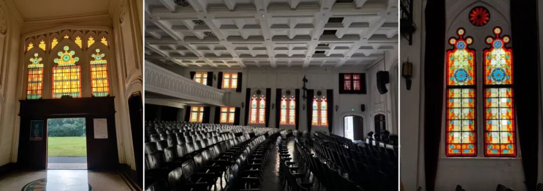 此外,邬达克在景莲堂有意强化了“光的戏剧性”——当阳光透过彩色玻璃窗,光线透窗而入,在室内形成七彩的光影效果,营造出一种近似教堂的神圣氛围,这一手法直接援引自中世纪教堂的空间修辞学。
