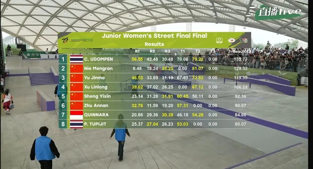 少年女子街式决赛采用“三轮走线+三轮大绝招”的高强度赛制,对选手的技术熟练度与临场心态把控提出了双重考验。赛场上,徐琳泷沉着应战,凭借稳定的发挥和流畅的技术动作,在亚洲精英选手中脱颖而出,用实力展现了中国少年滑板选手的风采。