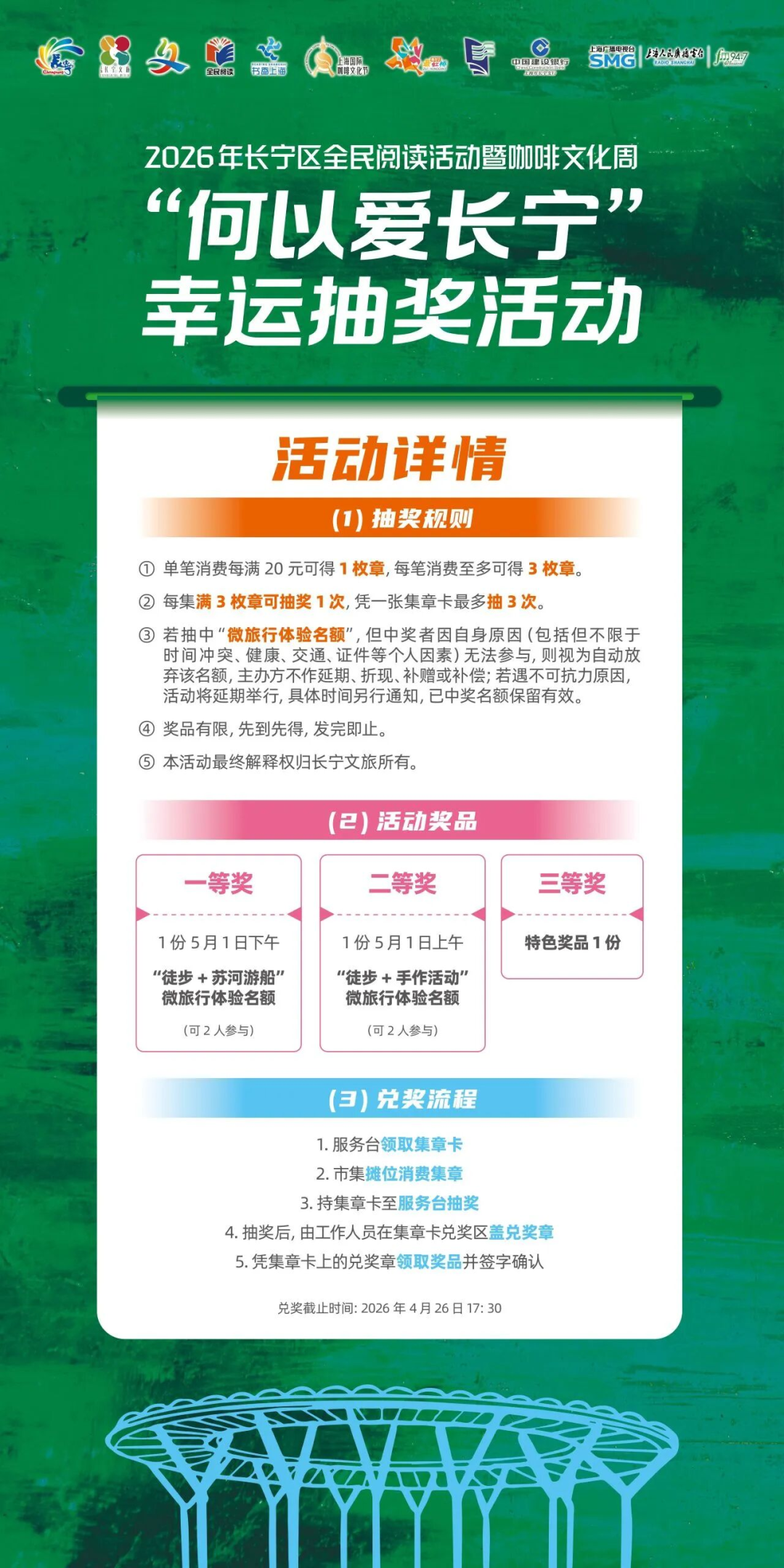 市集摊位消费满额即可参与抽奖。特色奖品涵盖“何以爱长宁”微旅行体验名额、长宁文旅特色文创、咖啡券等。奖品数量有限先到先得,让“书香+咖香”的快乐超长待机、不散场。