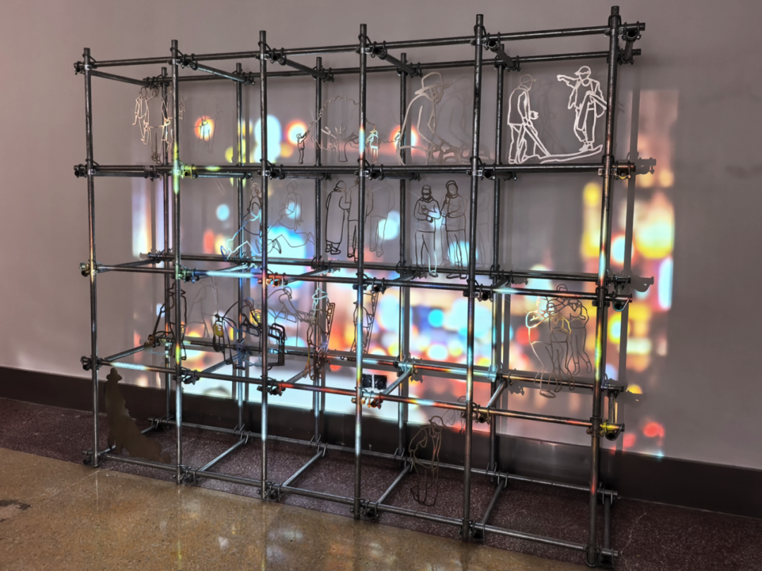姜宇慧的光影装置《城市剧场》,以精密的镭射切割工艺雕琢出极具写实感的人物剪影,车水马龙的白昼喧嚣、鎏金漫溢的黄昏暮色,不同时段的城市影像次第投射其上,仿佛为静态的城市轮廓注入了活力脉搏。