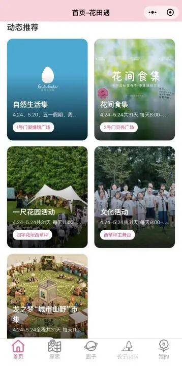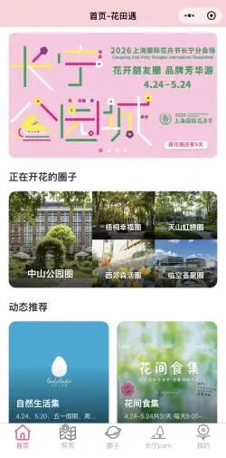 平台集导航、活动、打卡、权益于一体。首页“花田遇”实时推送市集、演出、休闲体验。