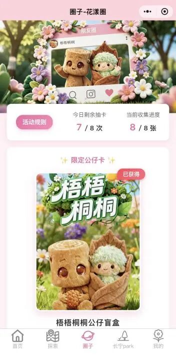 1张春日公仔盲盒卡,如果抽中公仔卡,即可兑换限量IP“梧梧桐桐”公仔盲盒。每个账号活动期间最多中1次,先到先得,送完即止。