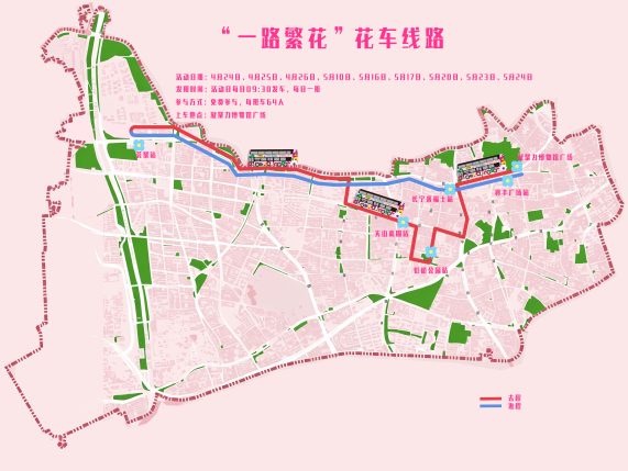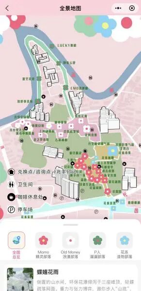 “花间游”提供全景导览,清晰标注点位与服务设施,并可直达“一路繁花”双层巴士、联名共享花车预约入口。