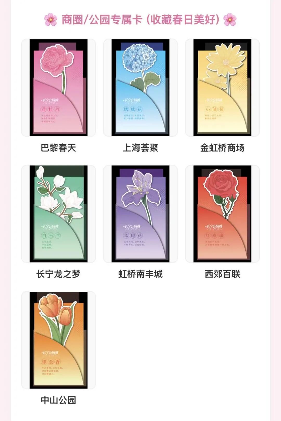 前往中山公园、长宁龙之梦、金虹桥、巴黎春天·悦汇天山、上海荟聚、虹桥南丰城、西郊百联等指定点位,扫描现场花卡二维码并完成定位,即可获得一次抽卡机会。