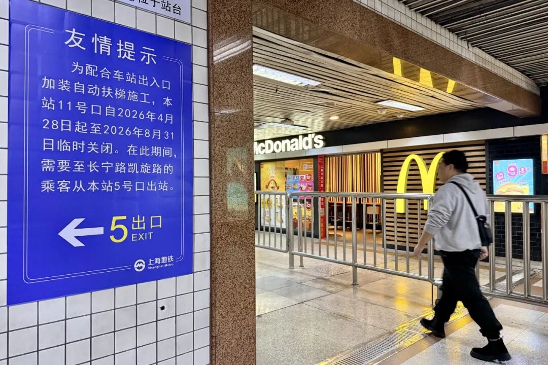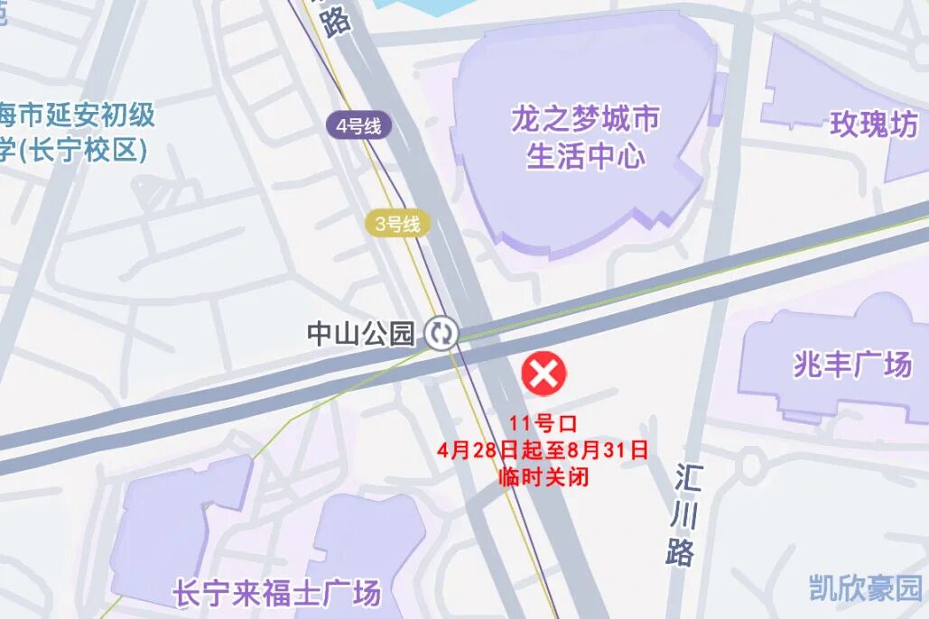 4月28日起,地铁2号线中山公园站11号口临时关闭,预计2026年9月1日起恢复使用。