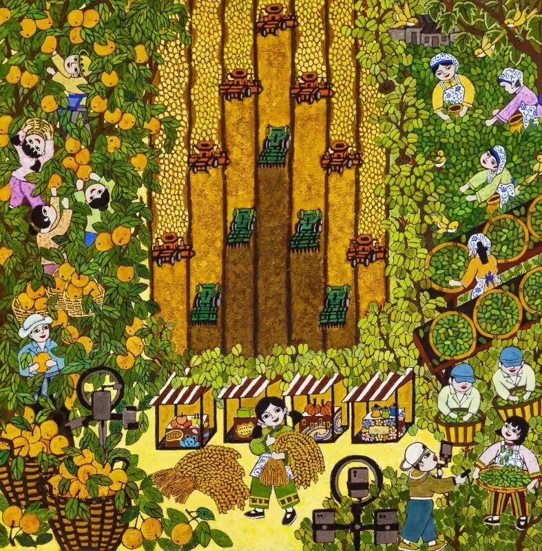 一方水土,一片画境。西郊,曾是上海西面一片生长稻禾与歌谣的土地,田埂上的汗水、灶台边的笑语、节庆里的锣鼓,都被一代代农民画作者采撷入画。随着城市发展,虽然曾经的田埂变成了如今的街巷,但西郊农民画未曾消失,而是换了一种生长的姿态。今天的西郊农民画,依然用熟悉的笔触描绘着这片土地上的人们,传统习俗与现代日常在同一张画布上对话。