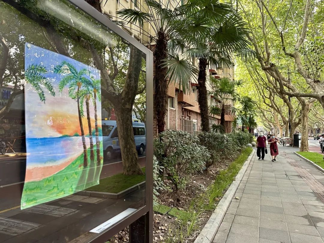 翠绿的椰子树叶、蓝色的海水、橙色的晚霞……路过新华路387号,一幅名为《海滨》的蜡笔风景画,以浓丽鲜艳、沉着厚实的艺术效果,为周边风景添了一份独特的美感。