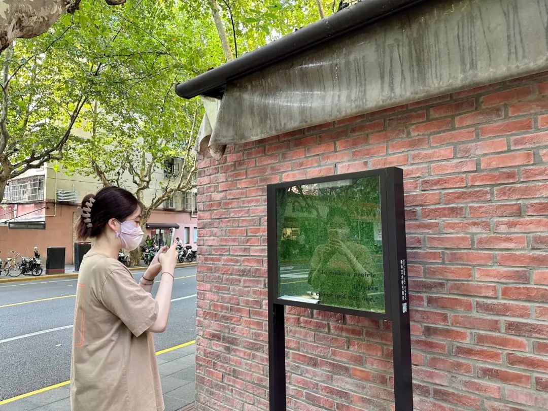 另一边的定西路602号,橱窗里的一抹绿色,在红砖墙的映衬下,格外醒目。这件装置艺术在橱窗里展示了塑料草坪。画框上则用英文写着“要造就一片草原,只需一株苜蓿和一只蜜蜂”。记者了解到,这件名为《要造就一片草原……》的作品,意在展示创作者对城市空间与视觉经验的敏锐体会。“塑料草坪短暂又持续地构建着城市的外貌,那么把它放入橱窗,特意展示出来,会有怎样的效果呢?这个过程或许就是一种艺术。”创作者李季纹说。