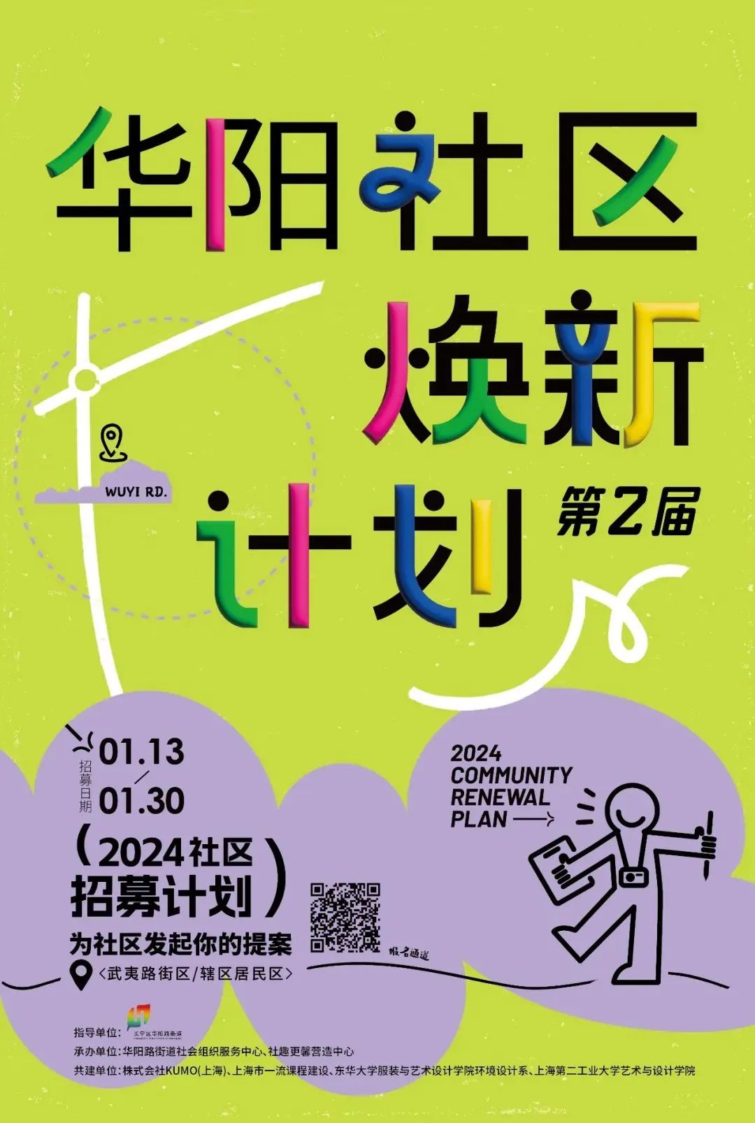 据介绍,2022年,华阳路街道启动了第一届社区焕新计划,由街道社会组织社趣更馨营造中心承办,第一届社区焕新计划以“五社聚力 社区焕新”为主题,通过社校联合的方式,围绕华阳路街道的武夷路与苏河湾两大街区,开展社区提案行动。