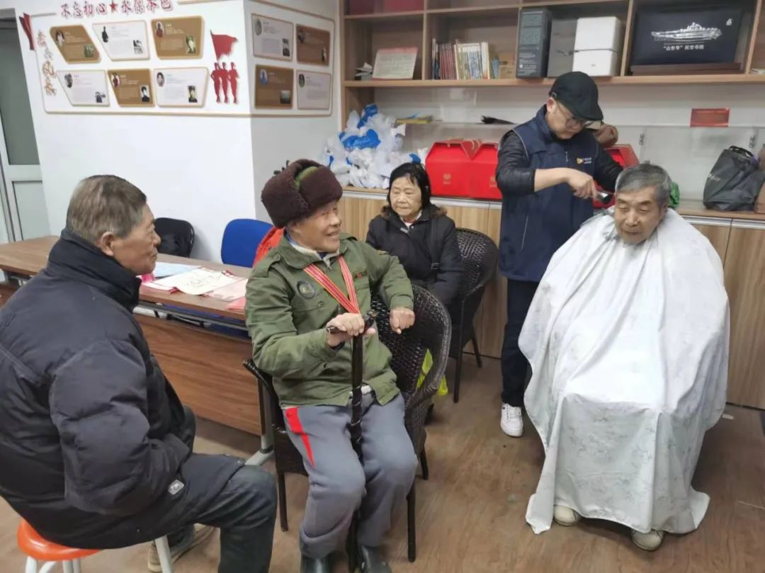 一把剪刀、一张座椅,免费理发摊位前有不少行动不便的老人正排排坐着,一边开心地聊天一边等待剪发。“工作人员知道我们腿脚不好,还搬来了椅子让我们坐着等,服务真细心啊!”老人们乐呵呵地说道。