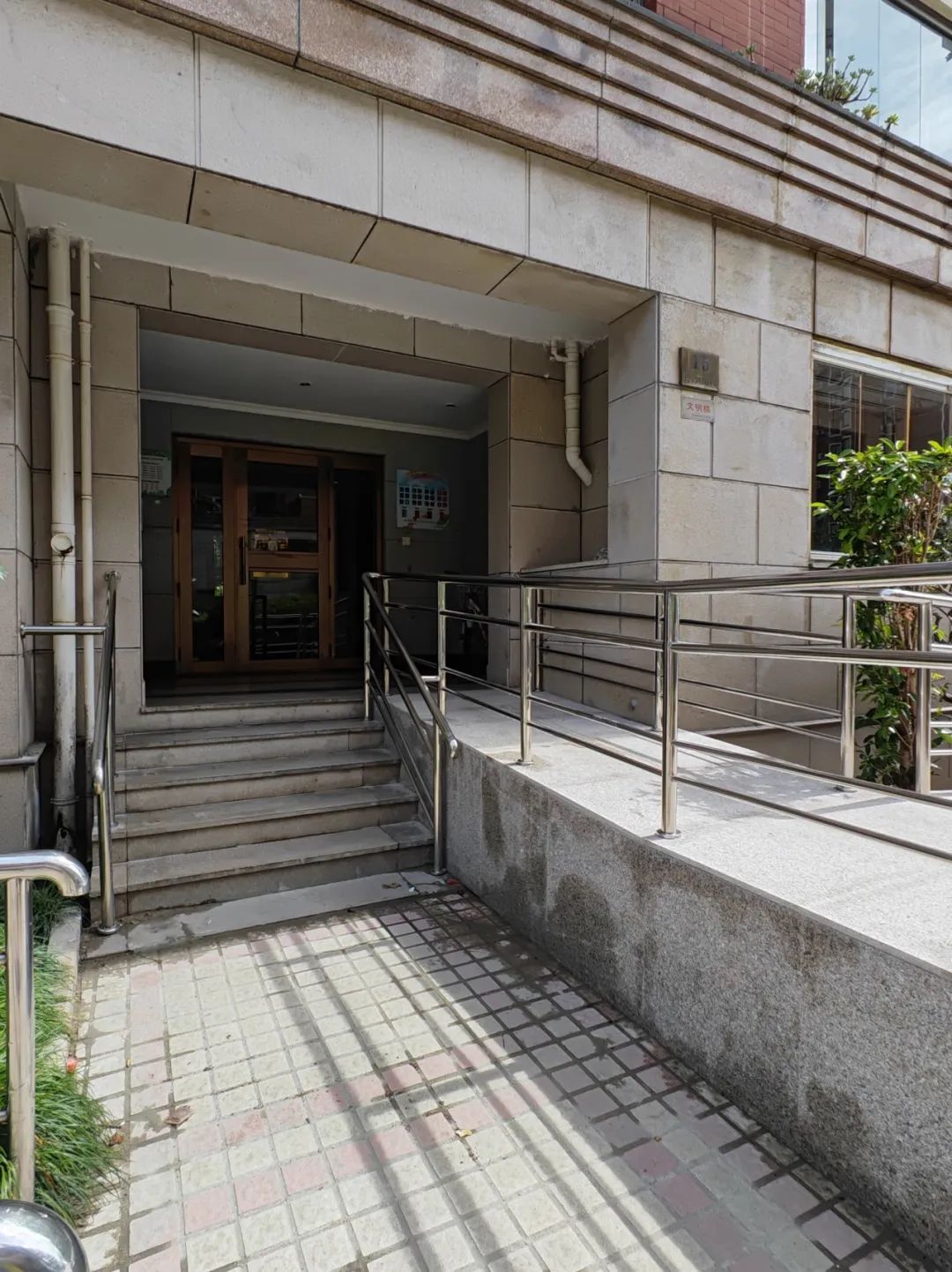 上海花城建于2000年,小区共有41个楼栋,几乎每个楼栋下都由台阶和坡道两部分组成,其中,无障碍坡道则根据楼栋建造特点,或左或右地向楼道一旁延伸,给居民通行带来更多的选择。然而,部分楼栋受“先天条件”不足、建设资源有限等影响,成为了无障碍环境建设的“拦路虎”,小区的15号楼就是这样的存在。