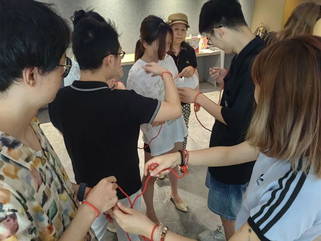 “千千结解手链”游戏充满挑战。参与者们两两一组,手腕间的绳索交错复杂。大家聚精会神,积极思考,相互协作,在不剪断绳索的情况下,凭借着智慧和耐心,一点点解开手链结,最终成功恢复绳索原状。这不仅是对智力的考验,更让彼此的默契在合作中悄然升温。