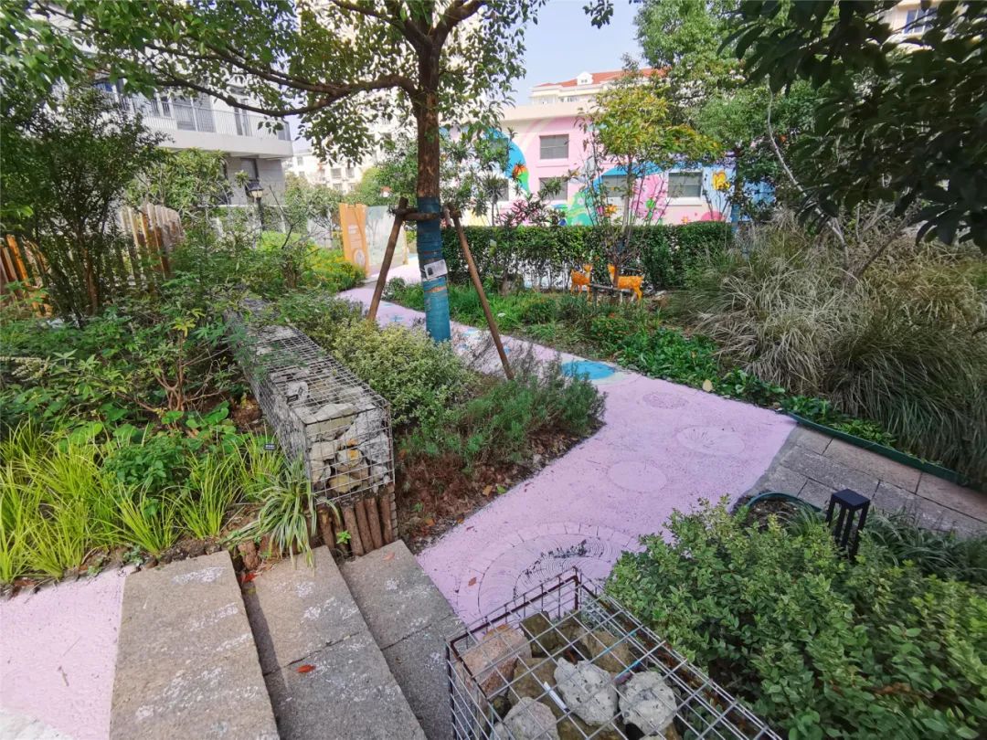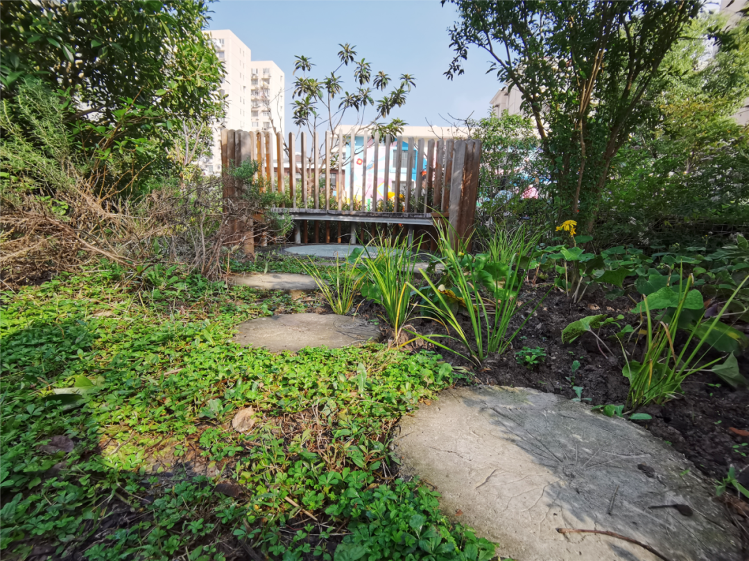 可以看到,花园灵活利用地势高点,营造了特色的“阶梯式”布局,空间错落有致,可远眺可近观,极大拓展了居民对花园的感受度。现场也有诸多“野生动物友好”的小角落,例如具有自循环增氧系统的生态塘、将在来年开花结果的柿子树、小径深处的绿植谧境,能为小动物们提供食源、水源和庇护所。