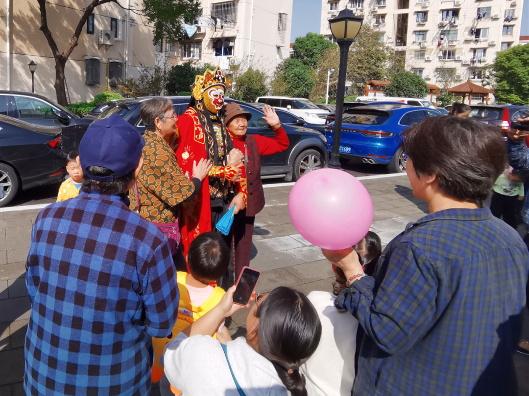 便民市集中,本地种植的农副产品、手工彩绘的体验项目、智能好玩的AI下棋,以及磨刀、配老花镜、更换纱窗等服务摊位,吸引众多居民前来,气氛其乐融融。活动特别设置打卡集章环节,参与者至新泾五村网红点位打卡即有机会获得小礼品,大家边玩边逛,不亦乐乎。川剧变脸演员与居民近距离接触,展现了非遗变脸艺术的绝技,表演后大家争相与演员合影留念。
