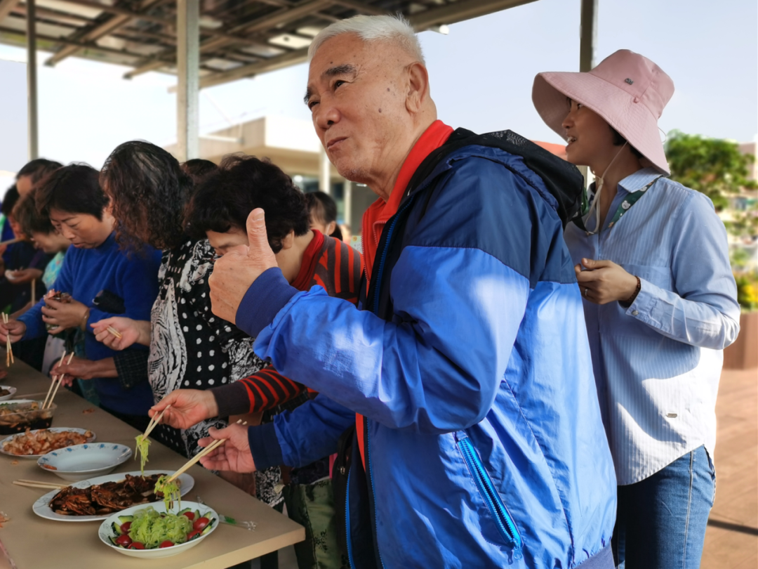 人气最高的莫过于家常菜品鉴。来到吾爱家居民活动中心三楼的吾家花园,长桌上摆满了居民亲手烹饪的佳肴,凉拌黄瓜、毛蟹年糕、菊花青鱼、玉藕蒸肉、白切鸡等香气扑鼻。“老灵额,这个凉拌菜的黄瓜可是我们自己种的。”“前几天刚摘,不要太新鲜。”大家提到的黄瓜来自吾家菜园,就在吾家花园旁。原来,平日里,居民自发组成的“护绿队”轮流“上岗”,不仅将番茄、生菜、茄子、芋艿分享给居民,而且将这份爱意送至孤老、高龄老人的家中。