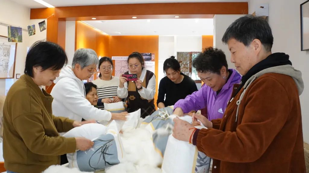 采摘结束后,居民们带着满满的收获回到室内,开始制作棉花抱枕。她们先是对棉花进行挑选和整理,然后混合其他纤维材料,一起填充到事先准备好的抱枕套中。在制作过程中,大家互相帮助、共同协作,当一个个精致的棉花抱枕被成功制作出来时,居民们的脸上都洋溢着喜悦。本次活动还吸引了共建单位志愿者的参与,她们表示收获颇丰,不仅增长了与棉花有关的的知识,还丰富了业余生活。