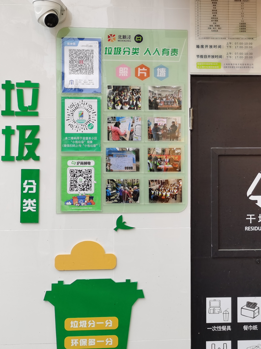 记者注意到,厢房特别打造了独具匠心的立体绿化,布置了展示新泾五村垃圾分类工作历程、居民参与活动的照片墙,提升厢房整体面貌,起到了教育和宣传的作用;同时,厢房开放时间、沪上回收二维码等信息经整合上墙,可供居民随时查看和扫描。