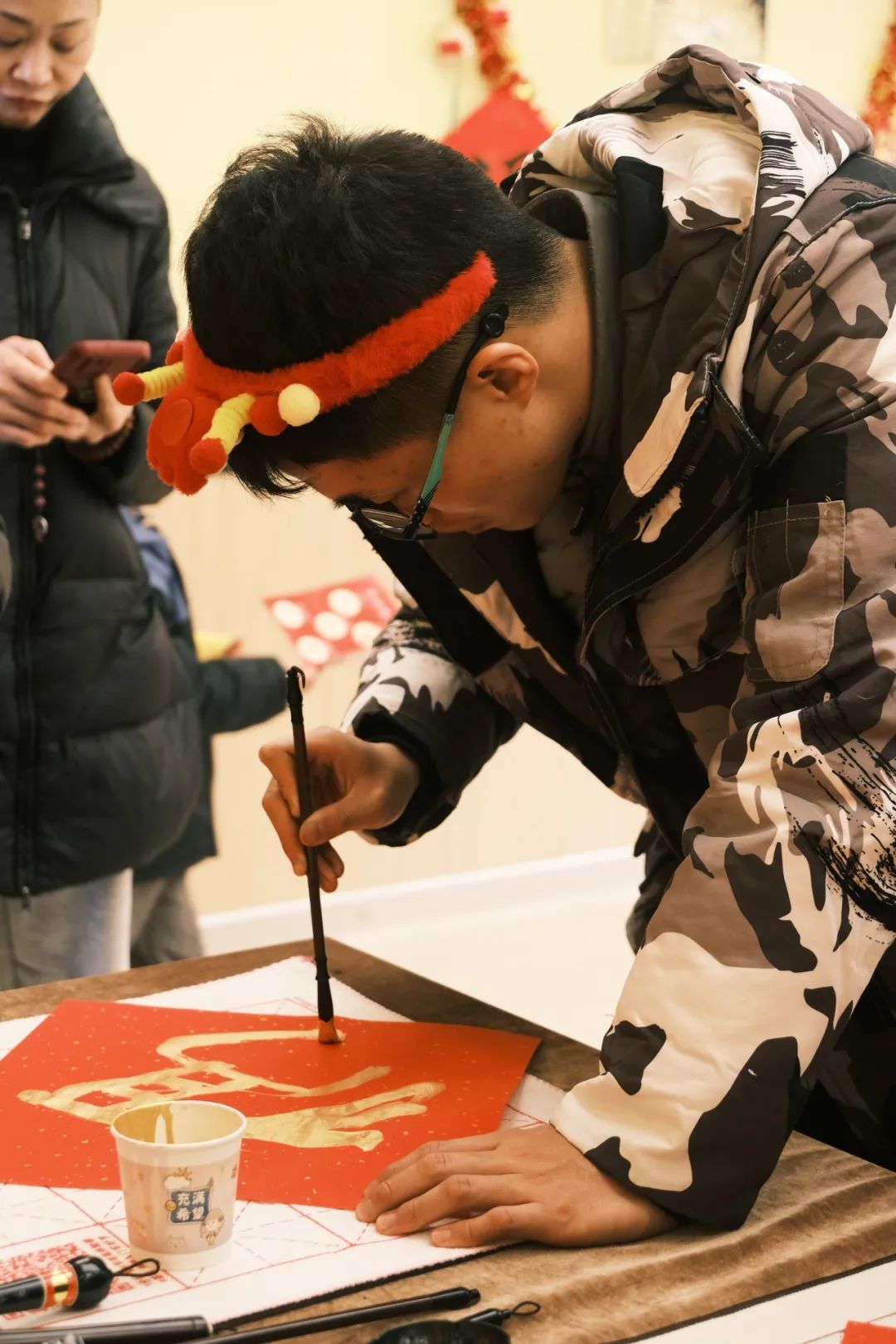 一旁的徽章DIY摊位前,孩子们拿起画笔描绘心中喜爱的图案,并把制成的徽章佩戴在胸前。过年少不了灯笼的装点,现场的灯笼DIY摊位,家长与孩子凝心聚神,一点点拼就了寓意吉祥的红灯笼。