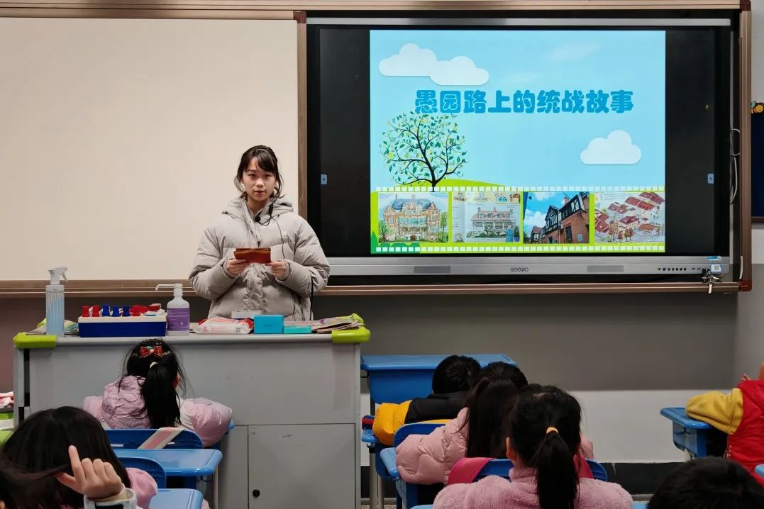 “今天我们要讲的,一位是抗日名将蒋光鼐,另一位则是被称为‘密使一号’的吴石将军......”站在故事发生地,高一学生袁慕恬以愚园路上的红色建筑、历史名人为切入点,为小朋友们带来了一堂《“童心”绘“同心”》主题爱国主义教育课,讲述了愚园路历史人物投身统战工作的英勇事迹。记者了解到,这位在江苏路社区生活、学习的“小老师”作为愚园路红色印迹宣讲团的一员,对这片土地上的红色故事“了如指掌”。“这是我第一次踏上寒托班的讲台,希望能让小朋友们了解愚园路上的红色历史,也期盼着能有更多的弟弟妹妹加入到宣讲员的行列中,让愚园路上的红色精神薪火相传。”