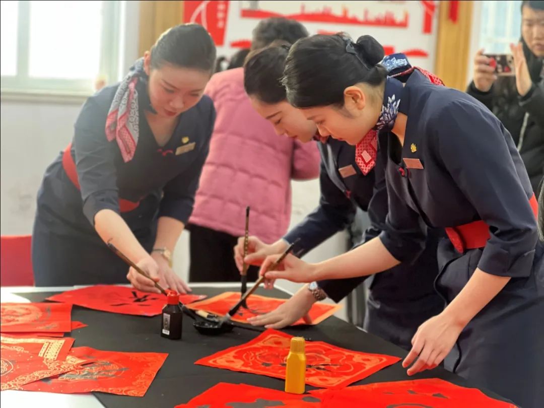 乘务员们还将刚刚书写好的“福”字送给在场的长者们。“阿姨,新年快乐!送您一张‘福’字,祝您新年福气满满!”长者们从乘务员们手中接过一张张“福”字和春联,喜笑颜开。