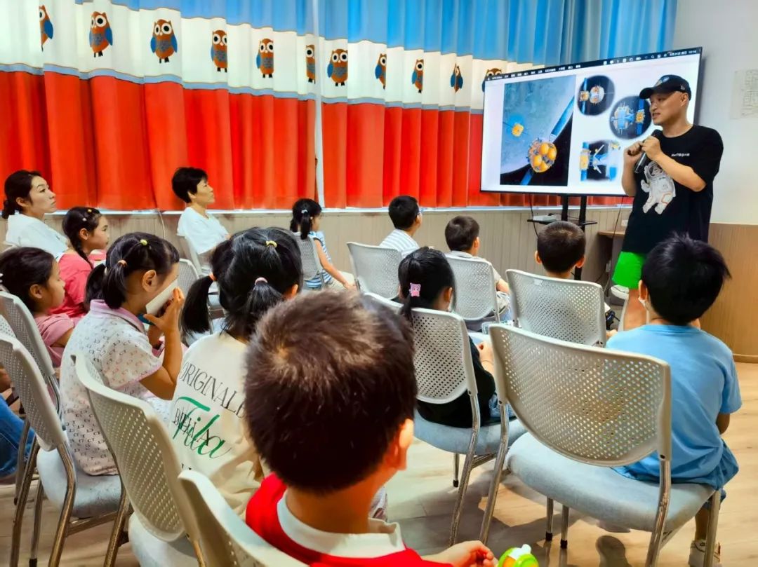 最让小朋友们着迷的,还是邓昕结合《我的中国航天课》绘本的讲解。聊到“嫦娥”探月,他把探测器在月球背面软着陆的过程,变成了一段“月亮上的探险故事”;说起“祝融号”火星车,又用“火星上的小向导”比喻,阐述它是如何在红色星球上“踩脚印”、做探测;就连听起来比较难懂的“悟空号”找暗物质,也被他用“宇宙里的寻宝游戏”这一比喻轻松化解,孩子们纷纷举着小手追问:“暗物质真的会发光吗?”