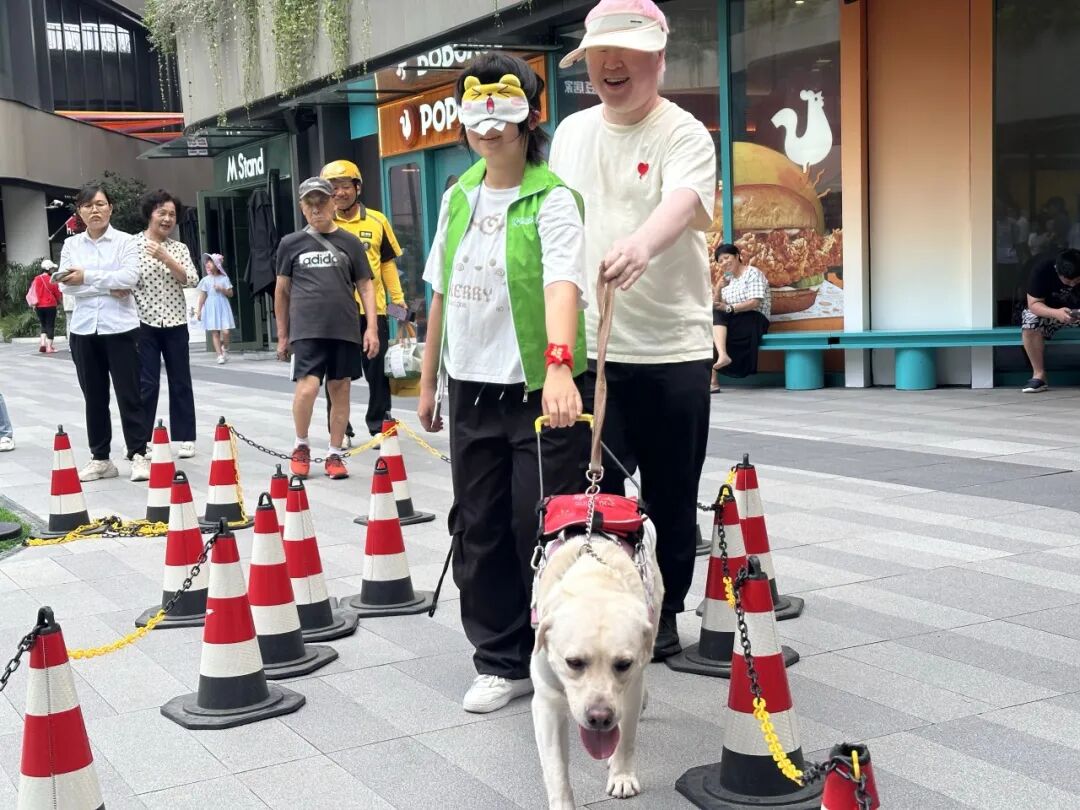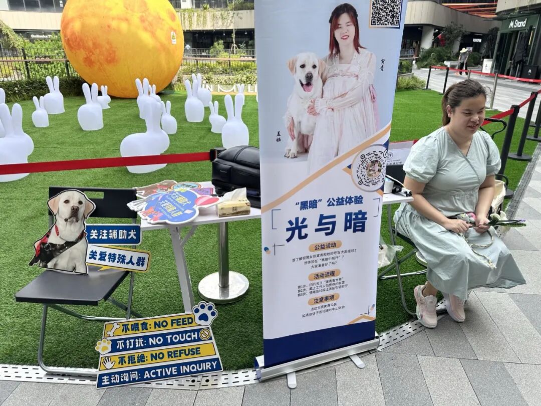 除了热闹的义卖摊位,市集现场还藏着不少“暖心亮点”。本次市集特邀2025“感动上海”年度人物荣誉称号获得者马寅青带来了“‘黑暗’公益体验活动”,在现场特设的体验区,孩子们戴上眼罩,在完全黑暗的环境中,借助盲杖或牵着导盲犬,小心翼翼地走完一段障碍路线。