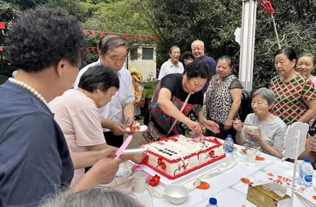 切蛋糕环节到来,活动氛围被推向高潮。志愿者们合力将印有“寿”字的蛋糕摆上桌,城管队员主动帮老人分切,农商银行工作人员递上纸巾,大家围在桌旁共享甜蜜,有的老人还举起手机拍照,念叨着“这么多人一起过节,比家里还热闹”。