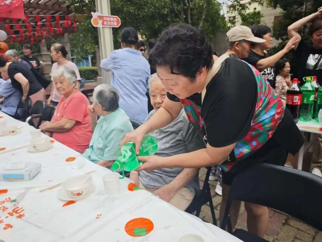 这场盛宴的热闹,离不开多方力量的支持。居民区门口的交通银行、农商银行作为共建单位,早早地送来了饮料与蛋糕,为宴席添了“甜蜜补给”;乐Xin网格的志愿者们,穿梭在长桌间,帮行动不便的老人热菜、递餐具,细致的服务让老人们吃得安心。