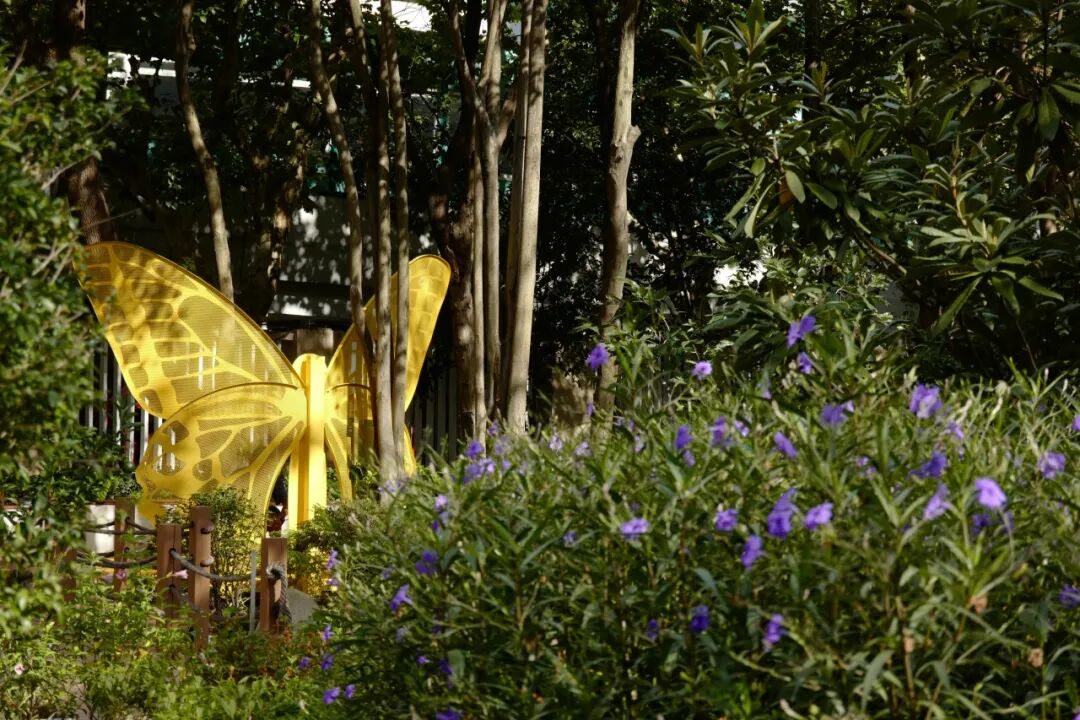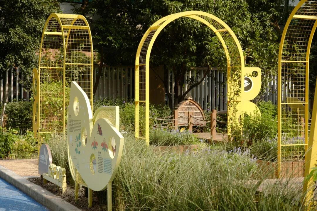“这片生境花园光照充足,我们注意到园内种植的许多开花植物能够吸引大量蝴蝶。因此,我们决定以蝴蝶为主题元素进行改造提升。”生境花园设计人员介绍,为了营造理想的蝴蝶栖息环境,花园特意配置了多种不同季节的本地蜜源植物和寄主植物,并增设浅水池、蝴蝶栖息架等设施,吸引蝴蝶在此停留、繁衍。同时设立科普展牌等,通过打造“海绵花园”“蝴蝶生态科普教育小径”“蝴蝶学堂”等功能区域,为居民营造出自然疗愈的社区花园。