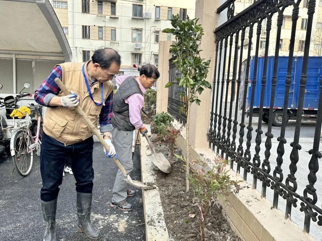 李同庆(左二)和居民志愿者一起更新小区绿化