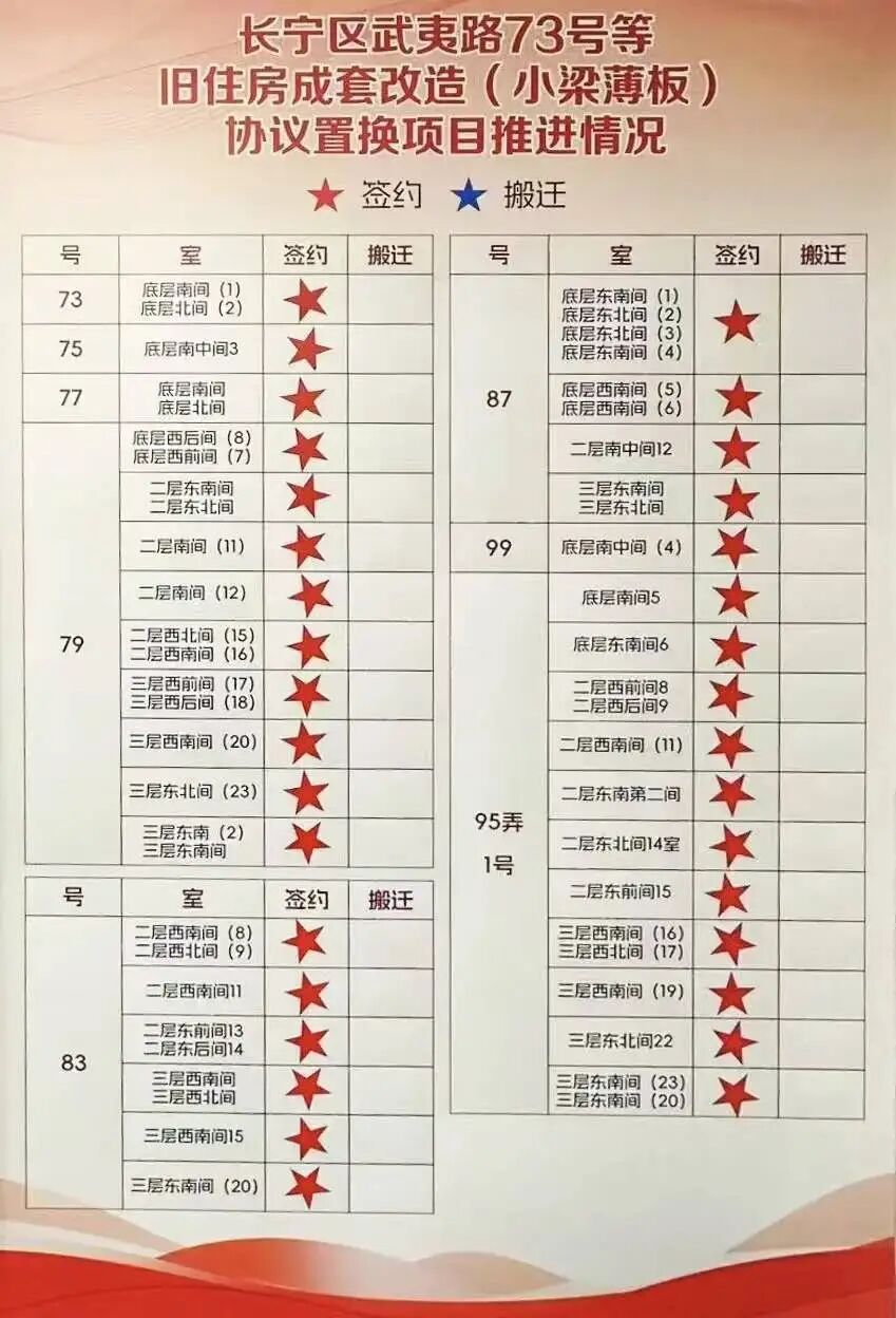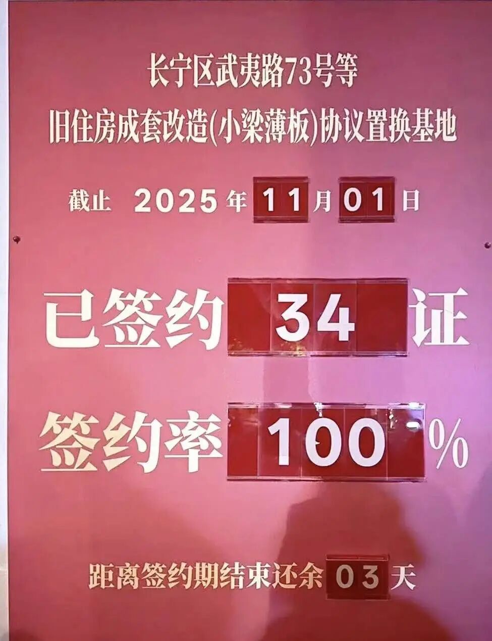 11月1日,随着《长宁区武夷路73号等旧住房成套改造(小梁薄板)协议置换项目推进情况表》上最后一颗红色五角星被精准标记,基地传来令人振奋的喜讯:该基地签约率达到100%!这份沉甸甸的成绩单,绝非偶然所得,而是多方协同、共同努力的结晶。