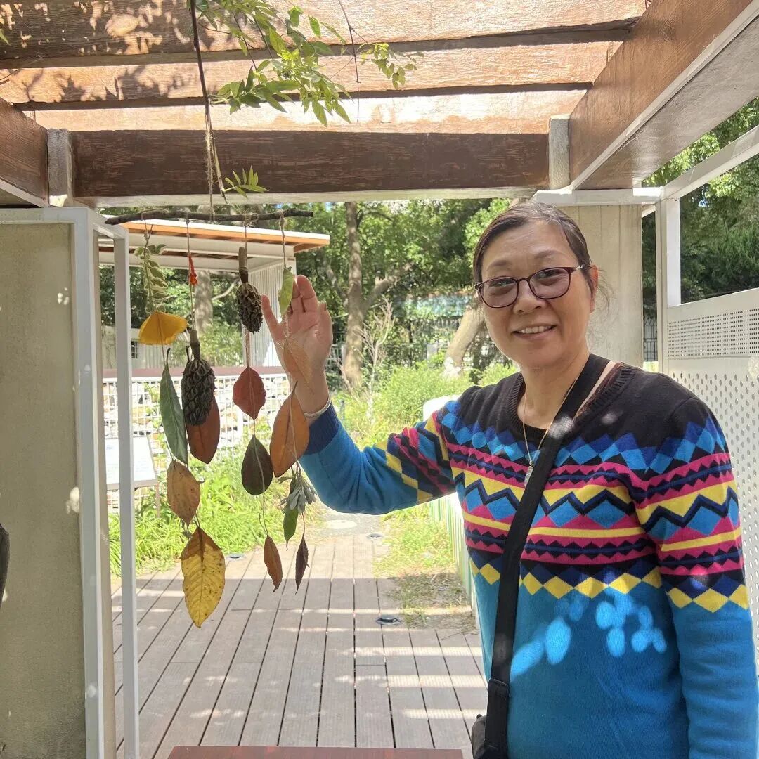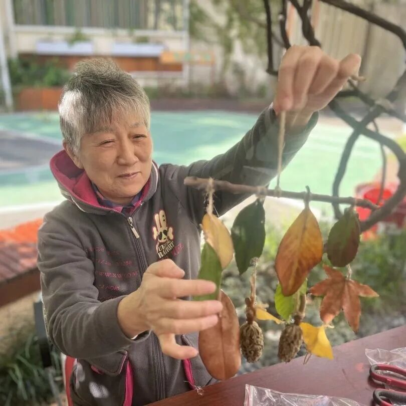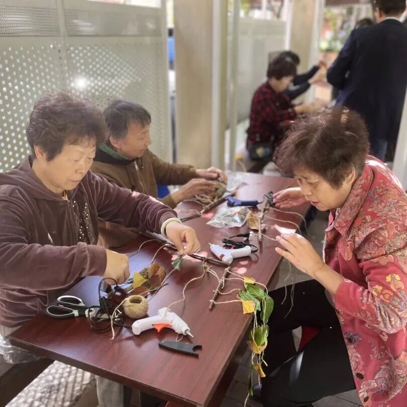 在“自然手作”体验区,社区居民与志愿者们脑洞大开,将掉落的树叶消毒、晒干之后,用麻绳、胶水等材料装饰一番,成为了别具匠心的风铃。