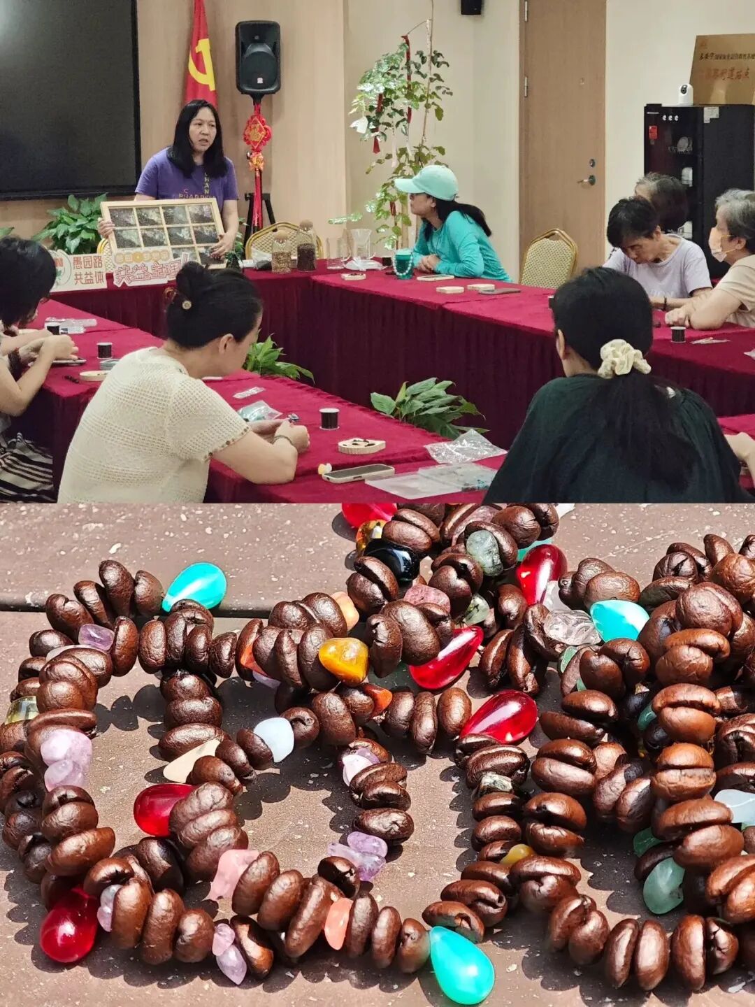 此次成果展示活动中,集中呈现了部分精选作品。例如,瑕疵咖啡豆、矿物宝石边角料组成的“陪伴手串”,由愚园路商户、1853潮咖旗舰店主理人金钰带领参与者一同制作。众人一同追溯上海咖啡文化的起源,通过手作艺术将“不完美”的咖啡豆和材料,转化为可随身携带的潮流单品,让日常饮品有了新的情感载体。