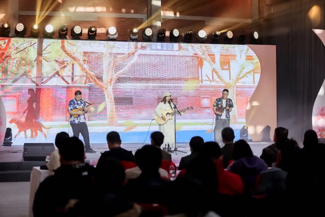 第二篇章“商荟礼遇·乐享新华”围绕“温度是乐于分享”的理念,展现社区文明与经济发展的双向赋能。新华社区文化活动中心带来的群文舞蹈《新华俪影》,用优美舞姿勾勒出市民幸福且充满活力的生活图景;新华路街道辖区商户代表演绎尤克里里弹唱《稻香》,让邻里温情与商业活力在旋律中交融。互动分享环节里,上海A.F.A、光籽艺术中心负责人分享了以暖心服务迎接入境游客的实践与感悟,展现出新华商户以文化为桥、以服务为媒的责任担当,让“人文新华”的温度渗透到社区生活的每一个角落。