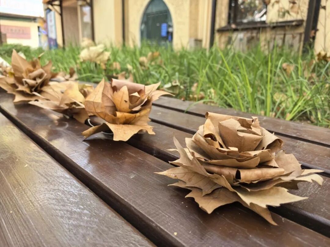 其实,这场艺术微更新,并非葛多个体的单向创作,而是一场全民参与的温暖共创。创作前,新华路街道邀请周边小朋友用梧桐落叶折成玫瑰;路过的居民围坐在一起,分享自己心中“幸福”的模样——有人说起和恋人七年长跑的约定,有人提到与伴侣不谋而合的送花默契,一片片落叶玫瑰在陌生人手中传递,悄悄“融化”了人与人之间的距离。沿街商户也主动加入,“吉呈面馆”老板不仅邀请创作团队进店吃面,还架起设备直播这场“城市治愈行动”,笑着感叹:“原来艺术真的能修补生活的裂缝。”