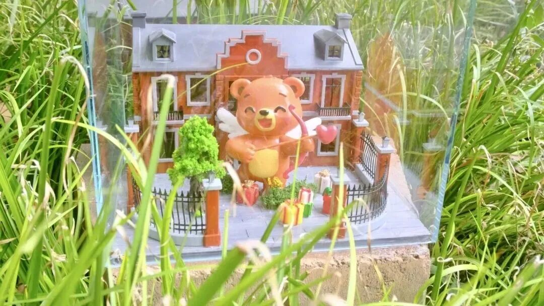 新·境文化展示廊内,一座复刻老洋房的微缩婚礼正在举行。长着翅膀的丘比特小熊站在前方,赐予新人浪漫和甜蜜的祝福。