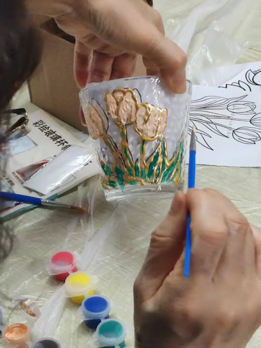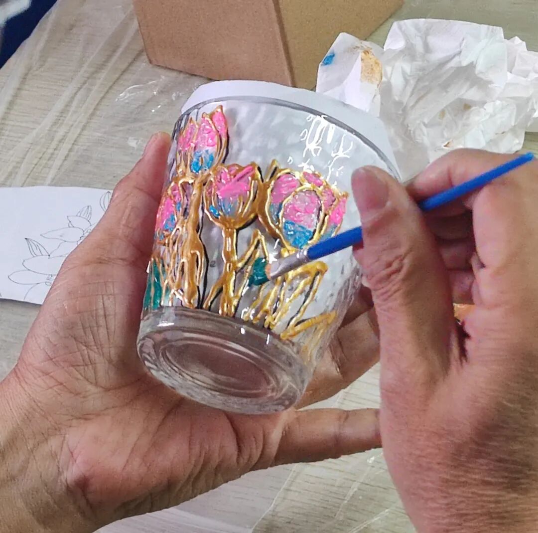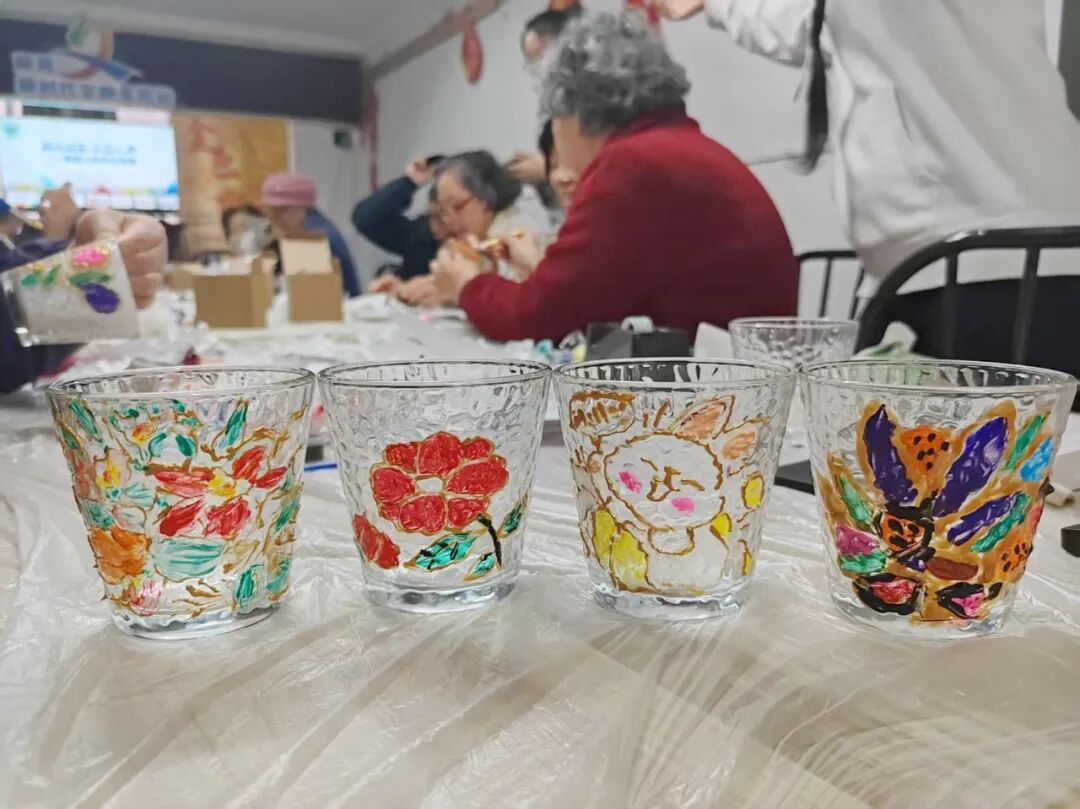 或是娇艳欲滴的花束,或是憨态可掬的小兔子……不一会儿,在居民们的巧手下,一幅幅各不相同的图画出现在了玻璃杯上,大家你看看我的、我瞅瞅你的,分享着彼此的构思和想法。