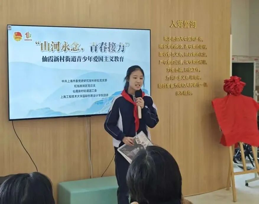 近日,中共上海市委党史研究室科研处党支部、虹旭居民区党总支、仙霞新村街道团工委、上海工程技术大学国际创意设计学院团委主办“山河永念,青春接力”爱国主义教育主题活动。