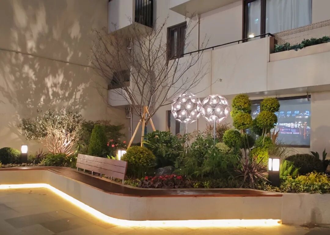 到了夜晚,街角又是另外一番景致。LED灯带勾勒出流畅的弧线,景观灯则如星河垂落人间,为夜幕下的天山路增添了些许温馨与浪漫。