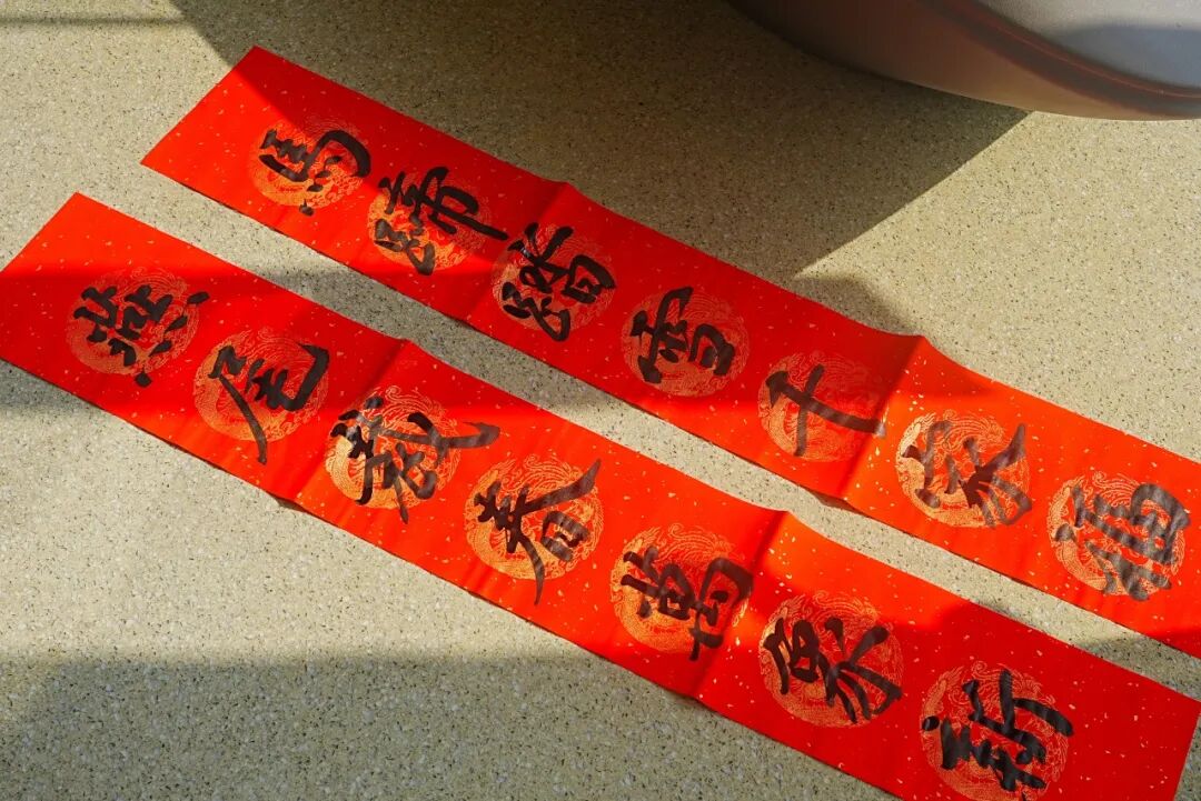 走进楼宇大堂,映入眼帘的是满地正在晾干的“福”字与春联,空气中则弥漫着浓郁的墨香。来自上海楹联学会以及中国书法家协会、上海书法家协会的书法家们现场挥毫泼墨,“春和景明”“马到成功”“万事顺遂”等吉祥词句跃然纸上。还有年轻人用自己的话说出了最殷切的期盼,“好运、喜乐、平安、啥都来”。