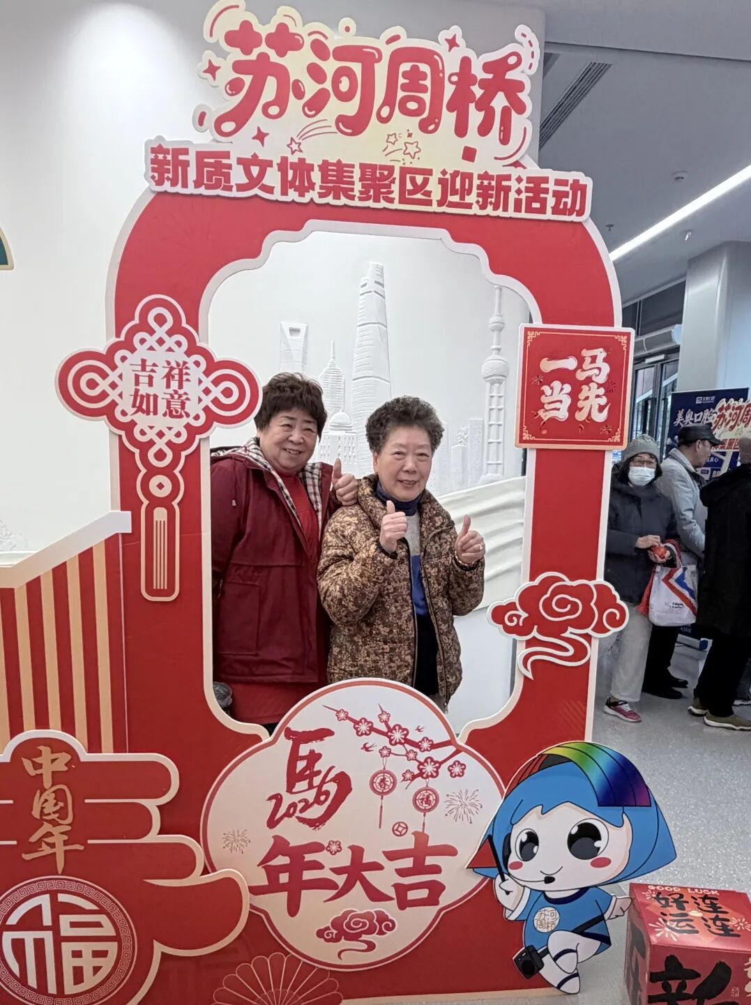 与此同时,一楼迎新市集拉开帷幕。一踏入党群服务中心,墨香便与年味撞了个满怀。乐豆教育的书法老师现场挥毫泼墨,一幅幅承载着美好祝愿的“福”字新鲜出炉,居民们排着队,接过红彤彤的“福”字,笑容满面。不远处的“骏马迎春”打卡墙别具巧思,鲜明的“苏河周桥”新质文体集聚区主题设计格外吸睛,大人小孩纷纷驻足,用镜头留住迎接新春的欢乐瞬间。