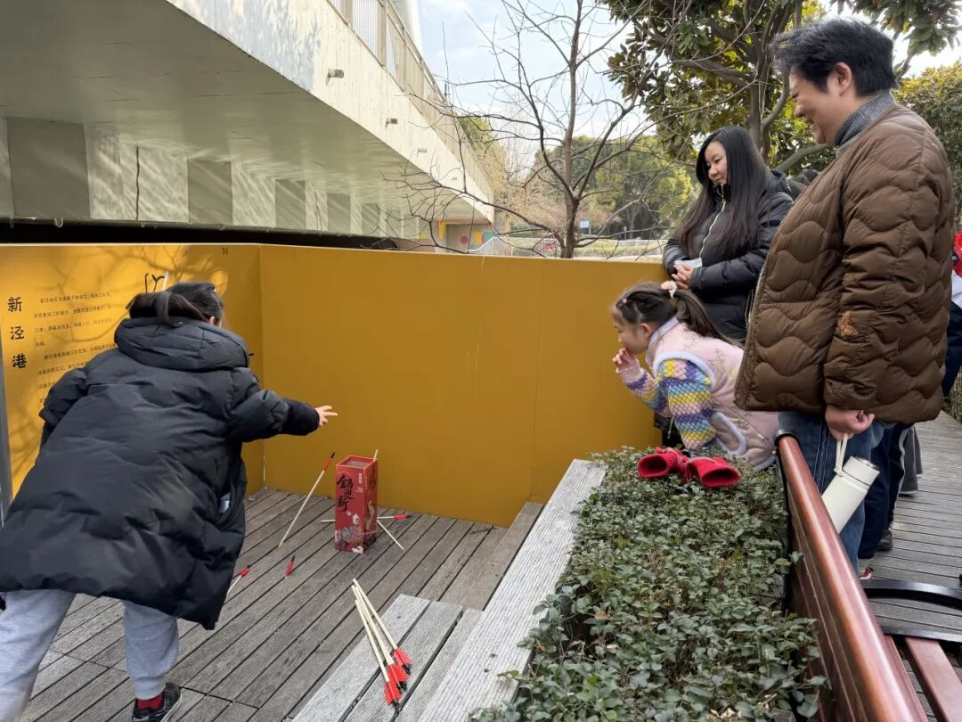 投壶、套圈、猜灯谜等传统游艺活动,自然地融入了花园的各个角落。灯谜挂在枝头、摆在石边,吸引大家驻足思考;“小泾泠”们尝试投壶,玩套圈,欢笑声此起彼伏。不仅如此,活动奖品均为融入花园元素的蝴蝶书签、钥匙扣等手工艺品,别具意义,体现着社区的美学与心意。